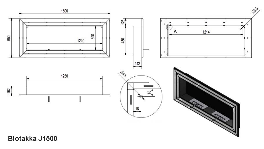 1500x600x400 mm. Biopolttimen polttoainesäiliö 2,5 litraa. Paloaika